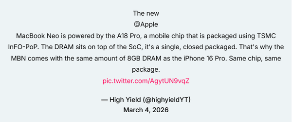 【CNMO科技消息】近日,据外媒报道,苹果新款MacBook Neo仅配备8GB内存非为了节约成本而刻意“偷工减料”,原因是其所搭载的A18 Pro芯片的底层设计。